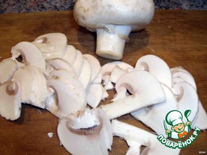 Грибочки тщательно моем и нарезаем тонкими пластинками.