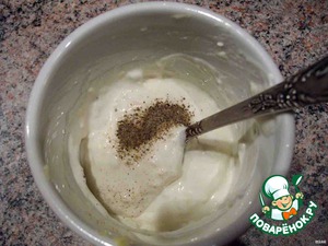 В майонез выдавливаем чеснок, перчик, перемешиваем. Намазываем этой смесью хлеб.