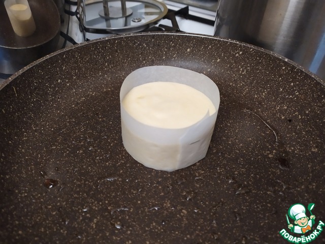 2. На разогретую сухую (или немного смазанную) сковороду ставим формочку и наливаем столько теста, чтобы, поднимаясь, оно дошло ровно до верха.