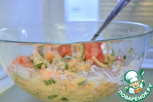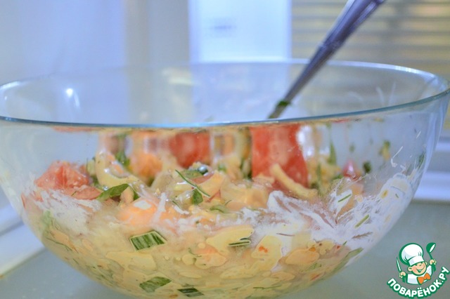 • Перемешать, убрать в холодильник на 15-25 минут, чтобы салат "не заплакал", но продукты пропитались.
