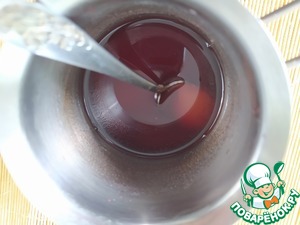 Для приготовления желейной оболочки десерта в сироп из малины добавить агар-агар оставить для набухания на 1 час, перемешивая периодически. Затем добавить по вкусу сахар, довести до кипения при постоянном помешивании, слегка охладить. Добавить 4 г желатина, размешать, подогреть до полного растворения, но не кипятить!