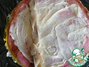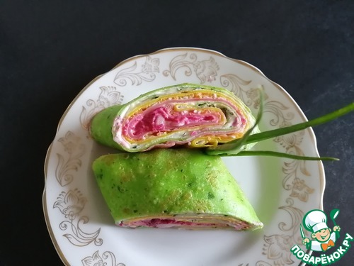 На пищевую плёнку кладём зелёный блин, распределяем четвертую часть начинки 1