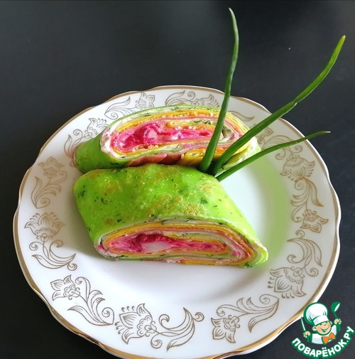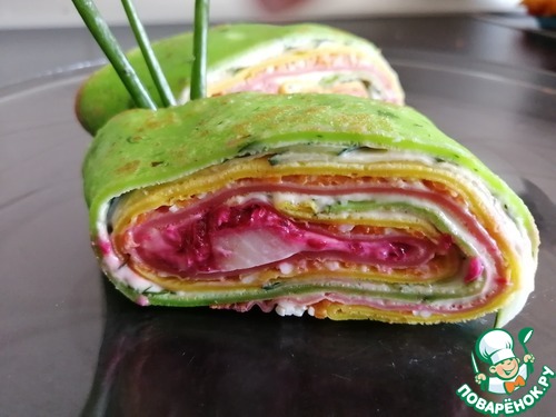 Холодная закуска из блинов, овощей и сельди. Очень яркая, красивая и сытная. Порадует гостей и станет ярким штрихом на праздничном столе