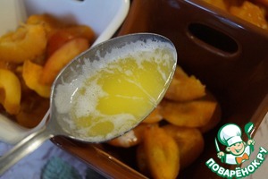 40 гр масла растапливаем в микроволновой печи и поливаем абрикосы. Примерно по 1 столовой ложке на каждую формочку.