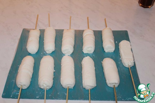 Досточку оборачиваем пищевой пленкой. Формируем сырки.