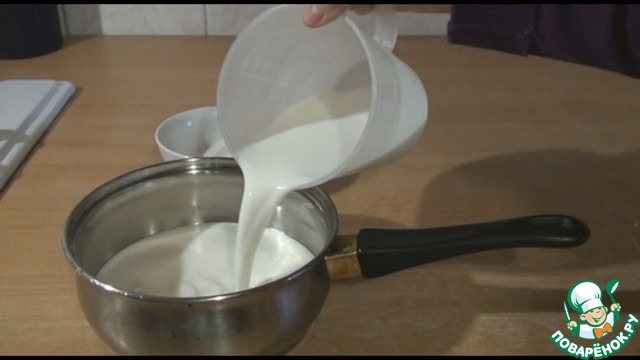 Сначала нужно сварить крем. Вливаем в сотейник примерно 400 мл молока, добавляем сахар, ванильный сахар, перемешаем и ставим на огонь, доведем до кипения.