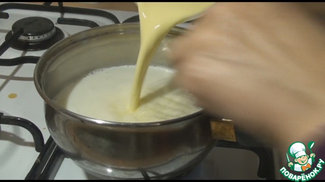 В оставшееся молоко всыпаем ванильный пудинг или кукурузный крахмал и хорошо перемешаем. Когда молоко начинает закипать, вливаем тонкой струйкой смесь молока с пудингом и постоянно помешивая, варим до загустения. Это происходит очень быстро, в течении 2-3 минут.