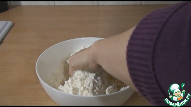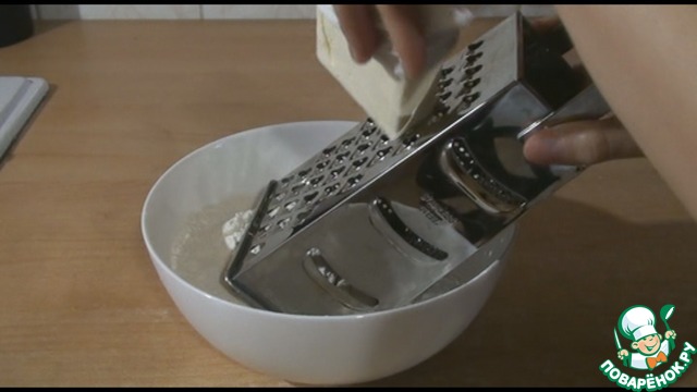 В просеянную муку натрем на крупной терке сливочное масло. Добавим щепотку соли и разрыхлитель, перемешаем.