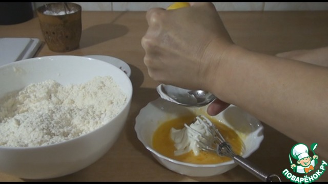В отдельной мисочке смешаем венчиком яйцо с сахаром, добавим сметану, лимонный сок, размешаем. Добавляем это всё к муке с маслом и быстро замешиваем тесто. Долго вымешивать не нужно, собираем в комок и достаточно.