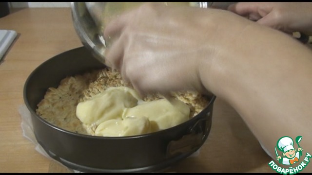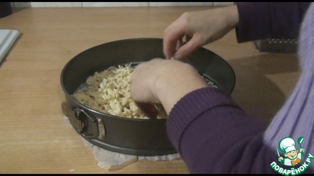 Форма у меня 28 см, меньший кусок теста натрем на крупной терке, руками распределим по форме, формируя небольшие бортики. У меня аэро-гриль, поэтому я отправила корж запекаться при температуре 180 градусов на 15 минут. Если у вас хорошая духовка, которая печет верх низ, то этого делать не нужно, сразу формируйте весь пирог и потом запекайте.