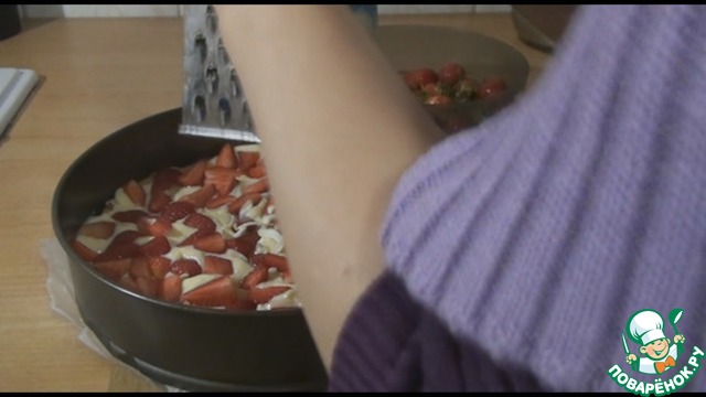 Сверху выкладываем нарезанную четвертинками клубнику и немного вдавим её в крем.