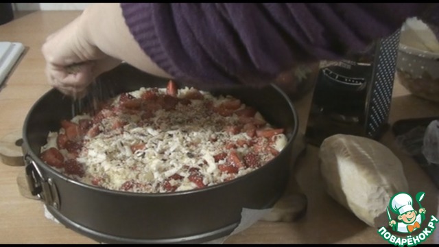 У меня оказались измельченные грецкие орехи и я сначала посыпала ими клубнику, а потом натёрла второй кусок теста. Делать это необязательно, но с орехами получилось очень вкусно, рекомендую. Запекаем в разогретой до 180 градусов примерно 40 минут, готовность проверяем деревянной палочкой.