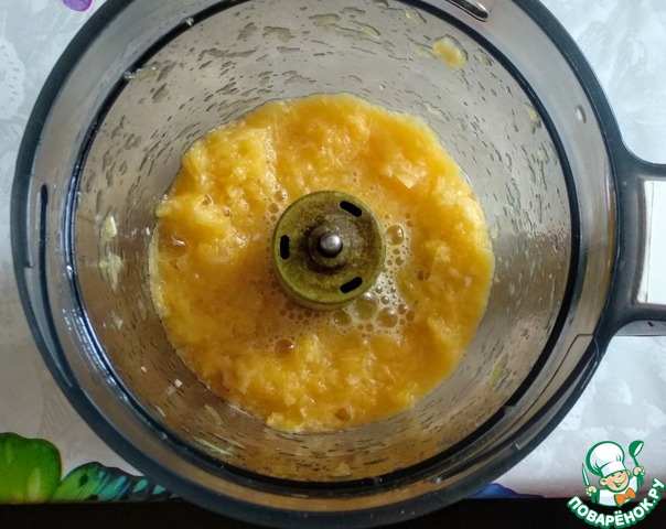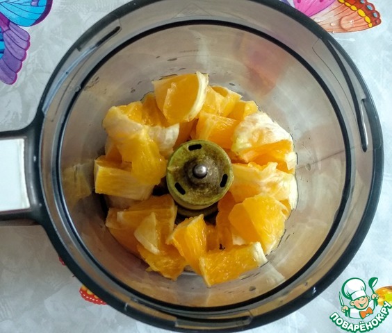 Апельсины хорошо помыть, очистить от кожуры (кожуру не выкидывать). Мякоть порезать и поместить в блендер.