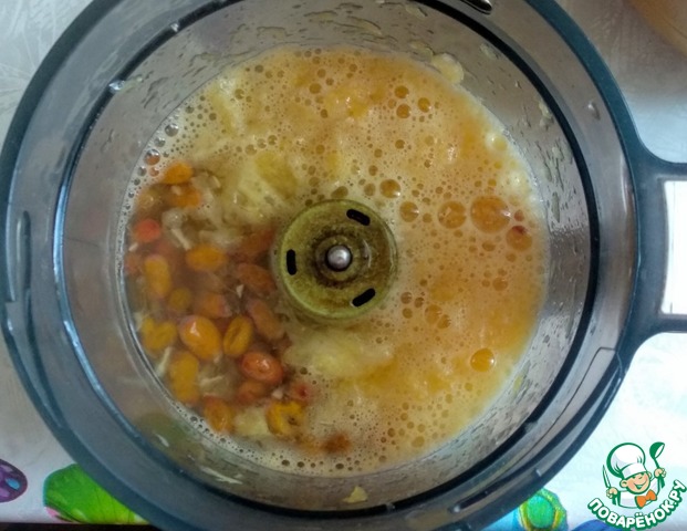 К измельчённым апельсинам добавить облепиховый отвар. И измельчить в блендере.
