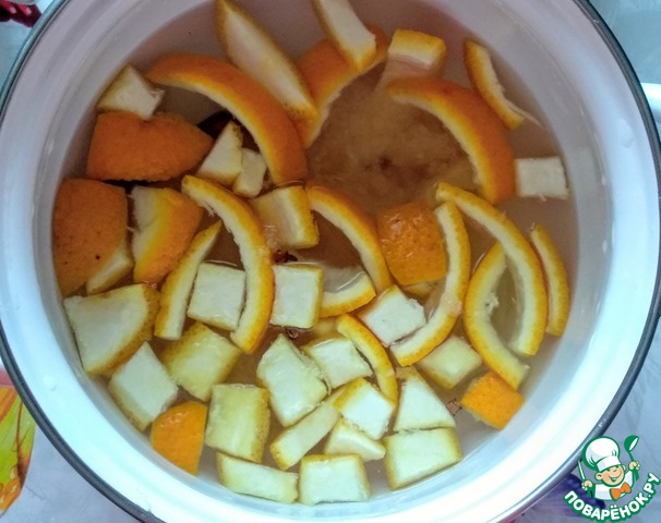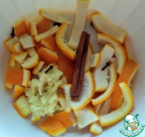 Далее приготовим следующий отвар. В кастрюльке соединить цедру апельсинов, гвоздику, палочку корицы, имбирь, нарезанный мелкими кусочками или натертый на тёрке.