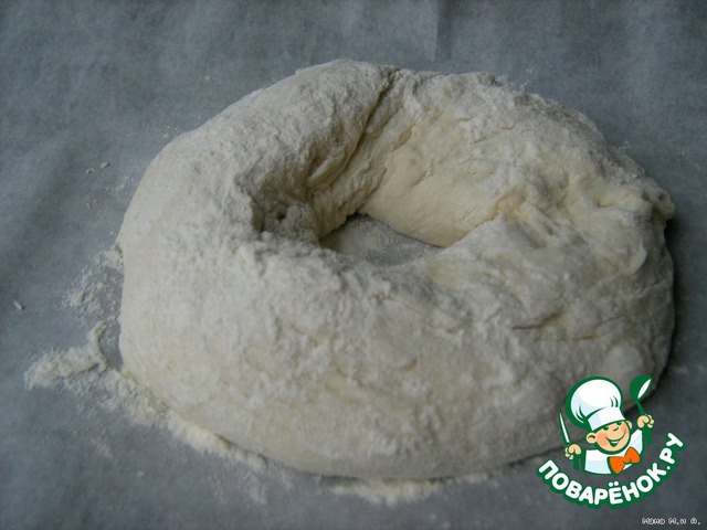 Скатать в шары и дать полежать 15 минут. Посыпать стол мукой и сформировать «бублики».