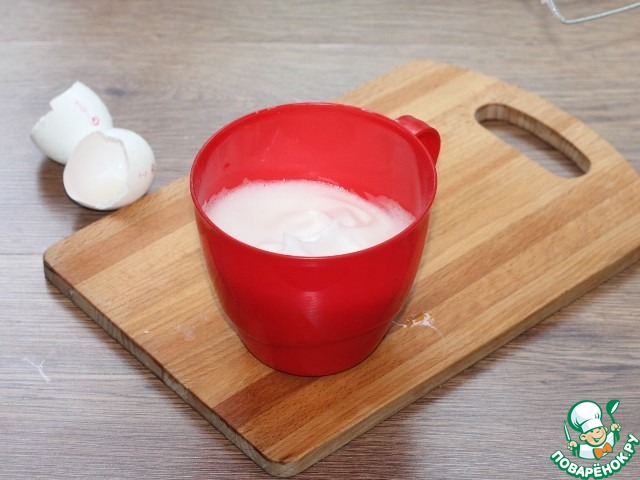 2. Охлажденные белки, взбиваем с щепоткой соли в крепкую пену.