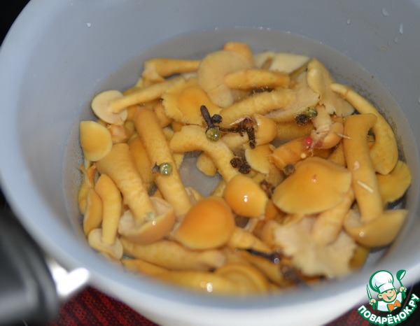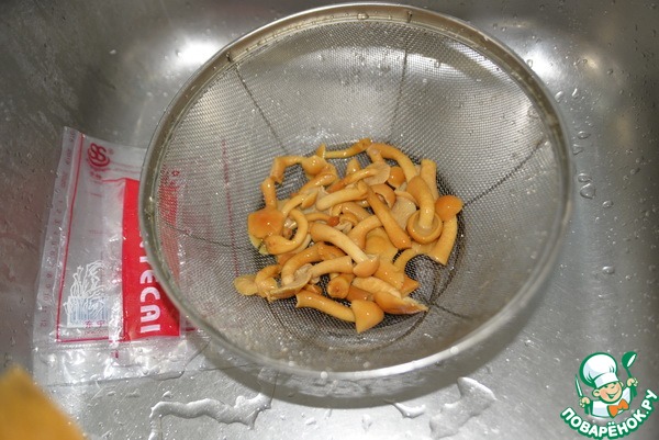 У меня покупные вареные опята. Возможно и у вас они продаются (китайские) в пакетиках. Опята промываем. -