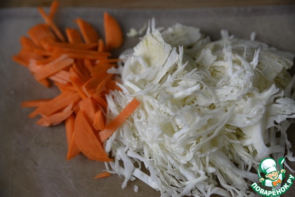 Молодую капусту шинкуем тонкими полосками. Морковь трём на тёрке, как по-корейски. Всё слегка обминаем с солью.