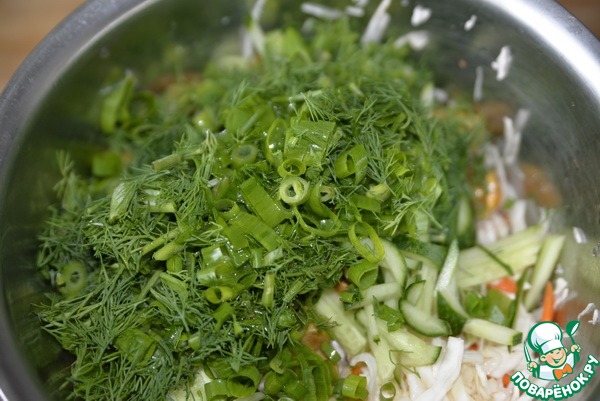 Добавляем рубленные зелёный лук и укроп. Кладём молотую смесь перцев. Заправляем салат растительным маслом.