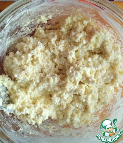 Просеять муку. Возможно муки понадобится больше, в зависимости от качества и жирности творога.