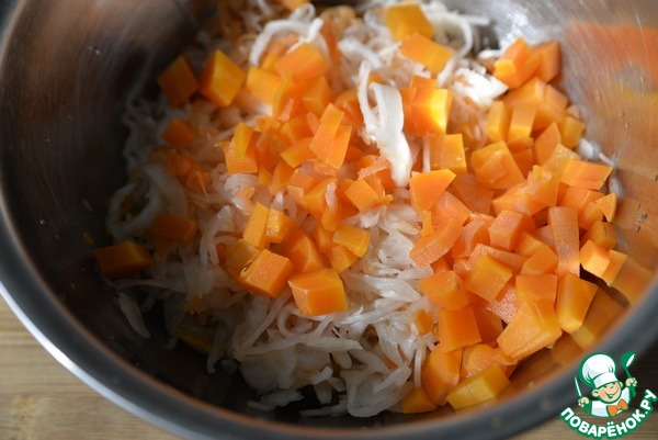Кладём соль, смесь перцев, растительное масло, перемешиваем.