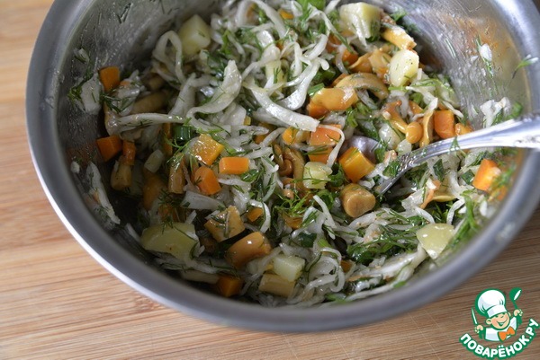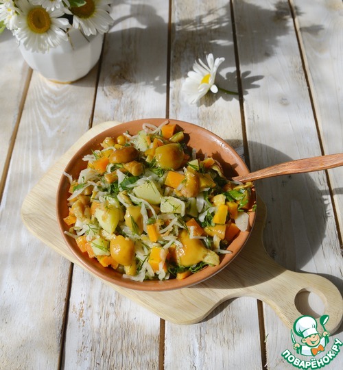 Салат, который может быть летом полноценными обедом или ужином. Прекрасное сочетание квашеной капусты и маринованных грибов с овощами и зеленью.