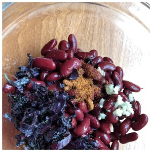 С фасоли слить жидкость. Чеснок пропустить через пресс, базилик мелко нашинковать. Добавить соль и аджику.