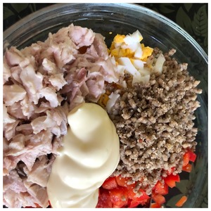 Перец и яйца нарезать маленьким кубиком, курицу разобрать на волокна или нарезать средним кубиком.
