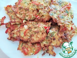 Капусты у меня было 300 грамм, перец 140 грамм (белый, поэтому не такие яркие как у вас), укроп 20 грамм и 30 грамм лука зеленого . Мука и крахмал по 2 ложки без горки, но не под нож...2 яйца не сильно крупных (50 и 55 грамм)