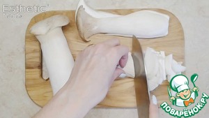 • Нарезаем тонкой соломкой грибы Эринги, лук можно нарезать полукольцами.