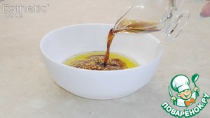• Тем временем нарезаем тонкой соломкой огурцы, так же как Эринги. И готовим соус к салату. Для этого в стеклянной посуде смешиваем оливковое масло, французскую горчицу (в зернах), рисовый уксус, соевый соус и мед. Все тщательно перемешиваем.