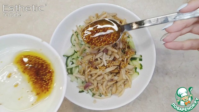 Тем временем нарезаем тонкой соломкой огурцы, так же как Эринги. И готовим соус к салату. Для этого в стеклянной посуде смешиваем оливковое масло, французскую горчицу (в зернах), рисовый уксус, соевый соус и мед. Все тщательно перемешиваем.