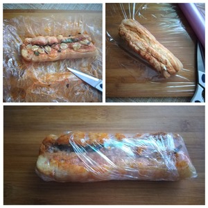 Ножницами разрезаем пакет с нитью. Даём немного остыть. Обсушиваем бумажным полотенцем и убираем с куска чеснок, лавровый лист и душистый перец. Заворачиваем туго в пищевую плёнку и убираем в холодильник. Я делала на ночь.