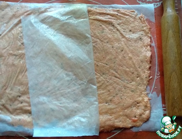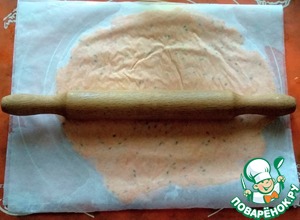 Сверху накрыть ещё одним листом пергамента и раскатать скалкой, толщиной, примерно, 3-4 мм.