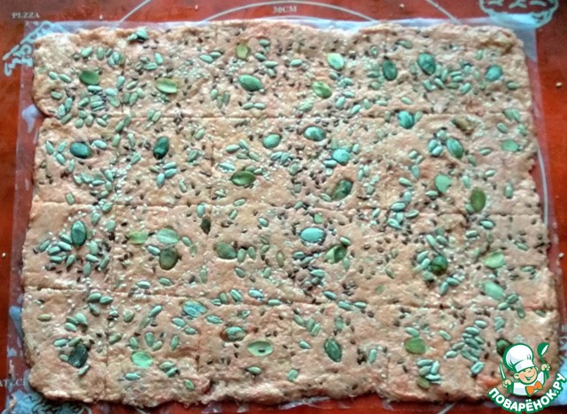 Посыпать кунжутом (0.5 ст. л), семенами льна (0.5 ст. л), подсолнечным и тыквенным семечками. Ещё раз прокатать скалкой, чтобы "утопить" семена. Готовить в духовке, заранее разогретой до 180 градусов, 15-20 мин., больше не надо, иначе можно пересушить.