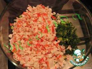 Измельчаем огурчик, укропчик, крабовое мясо и один помидорчик.