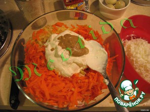 Смешиваем сыр, 2 желтка, измельченный чеснок и 2 ст. л. сметаны с помощью блендера в однородную кремообразную массу. Добавляем соль и перец по вкусу, покрываем этой смесью равномерненько салатик.