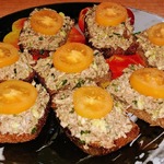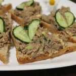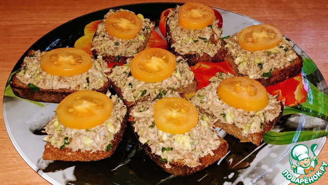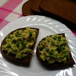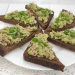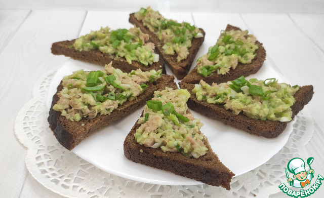 4. Бородинский хлеб нарезаем кусочками, выкладываем на ломтик хлеба пасту из авокадо и тунца, украшаем зелёным луком.