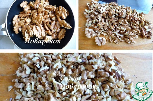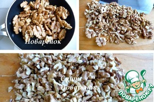 Ядра грецкого ореха обжарить на сухой сковороде, порубить ножом.
