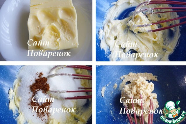 В миску выложить размягченное сливочное масло, растереть его венчиком. Добавить сахар, ванильный сахар, корицу соль. Растереть все венчиком, масса собирается в "ком", нужно венчик ударить об миску и продолжать растерать 2-3мин., не забываем стряхивать массу с венчика.