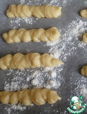 На противень выкладываем пергамент, присыпаем мукой. Выдавливаем полосками тесто на 6-7 см. Отправляем выпекаться в разогретую до 200 градусов духовку на 25-30 минут