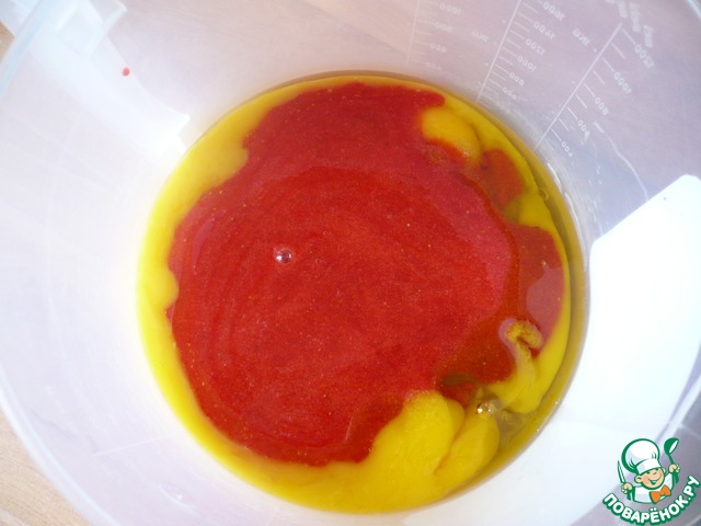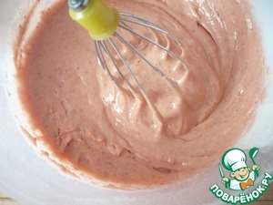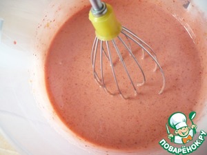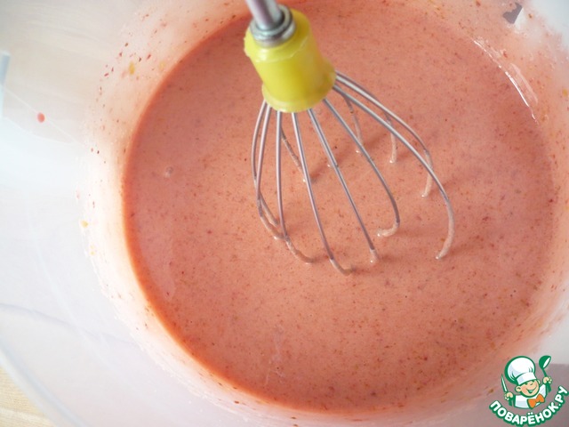 Венчиком взбейте массу из желтков и клубничного пюре. Должна получится воздушная, кремовая масса.