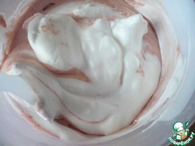 Далее тесто будем вымешивать с помощью лопатки. Сначала добавьте в тесто треть белков и начинайте перемешивать круговыми движениями от краев к центру. Нужно вмешивать белки тщательно, но аккуратно. Добавьте еще треть белков и снова вмешайте в тесто. Затем добавить оставшиеся белки и опять тщательно, но аккуратно перемешать тесто.
