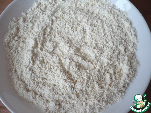 Для приготовления клубничного бисквита просейте муку, добавьте разрыхлитель теста и все перемешайте венчиком, на время отставьте в сторону.