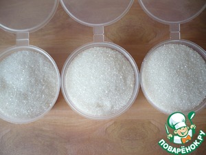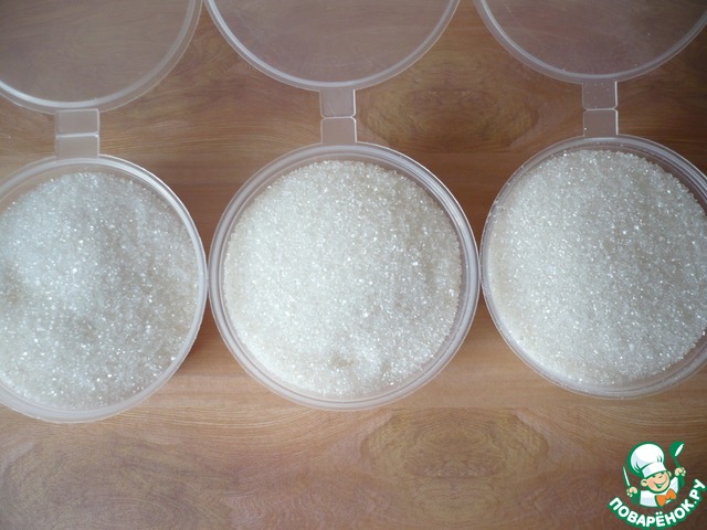 Разделите 150 г сахара на три равные части: по 50 г. (для желтков, для белков и для клубники).