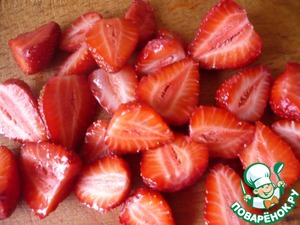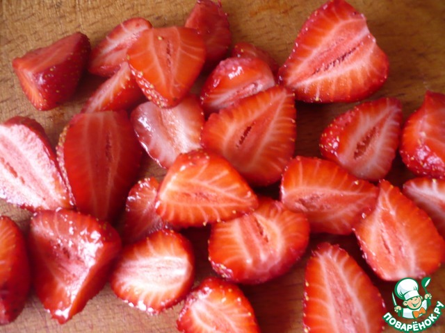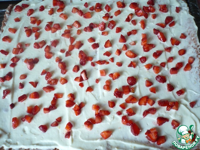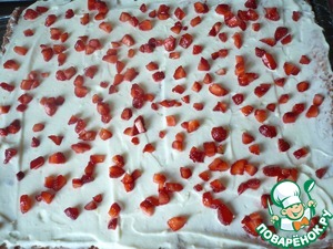 Сверху на крем выложите мелко нарезанную клубнику (разбросав её по всей поверхности).
