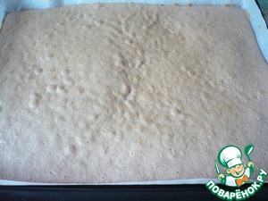 Противень размером 40х30 см, застелить пекарской бумагой. Выложить приготовленное тесто на противень, аккуратно и довольно быстро распределить его по всей поверхности. Выпекать бисквит в прогретой до 180 градусов духовке 18 - 20 минут (максимум). Ориентируйтесь на вашу духовку.