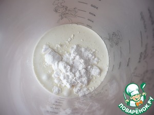 В другой емкости смешиваем холодные сливки с 10 г сахарной пудры и взбиваем с помощью миксера с стойкий крем.