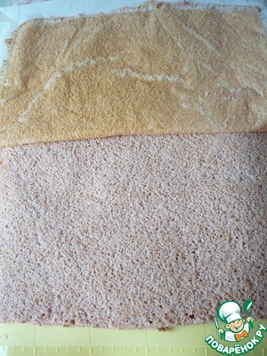 Сверху накрыть бисквит силиконовым ковриком или пергаментным листом бумаги и перевернуть бисквит. Аккуратно снять пергаментную бумагу, на которой выпекался бисквит.